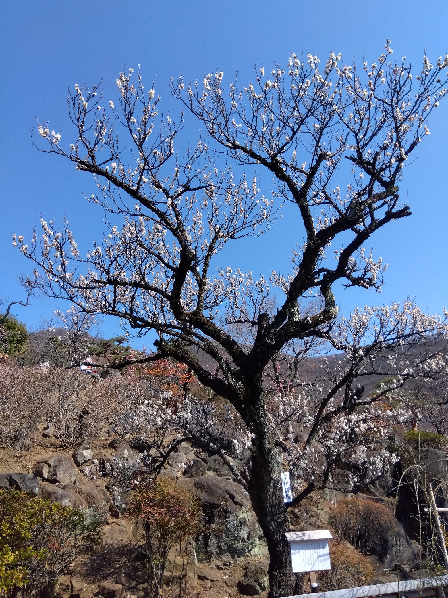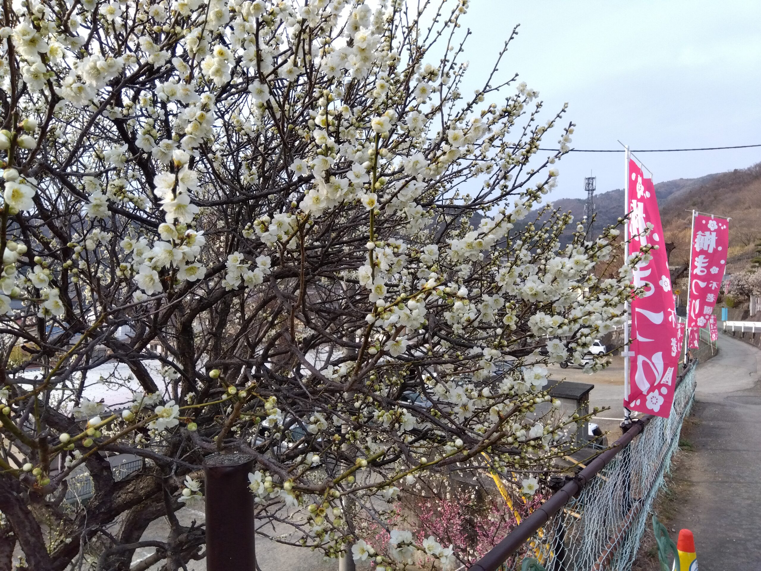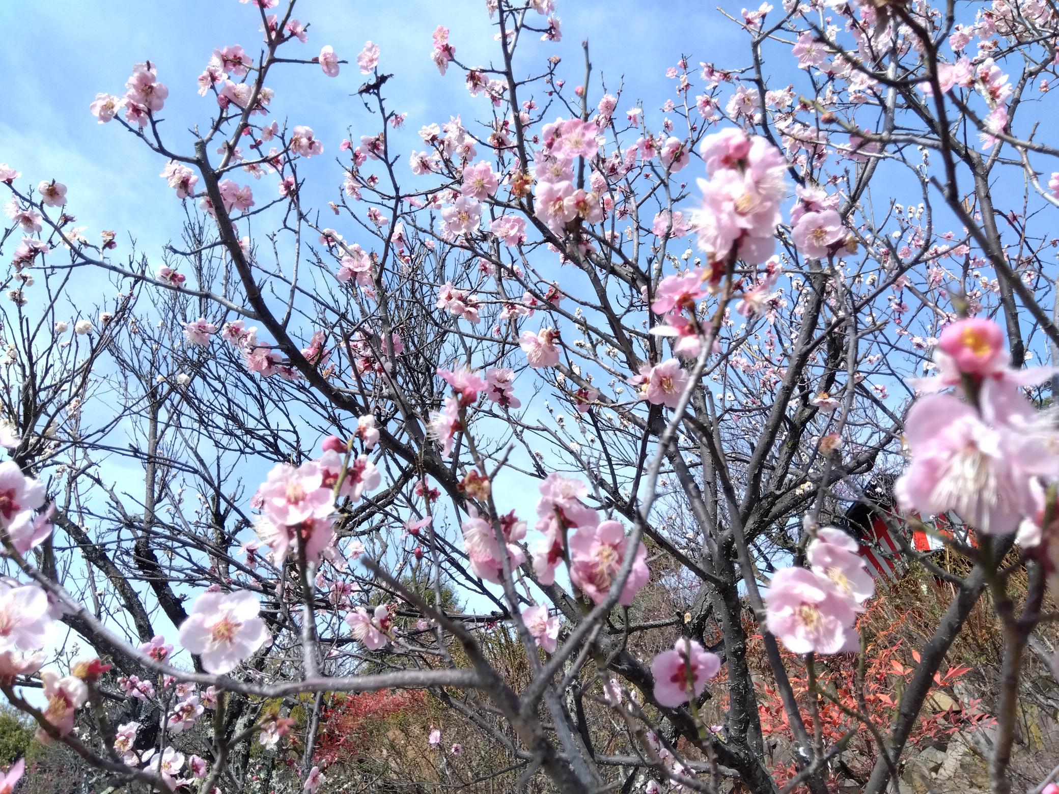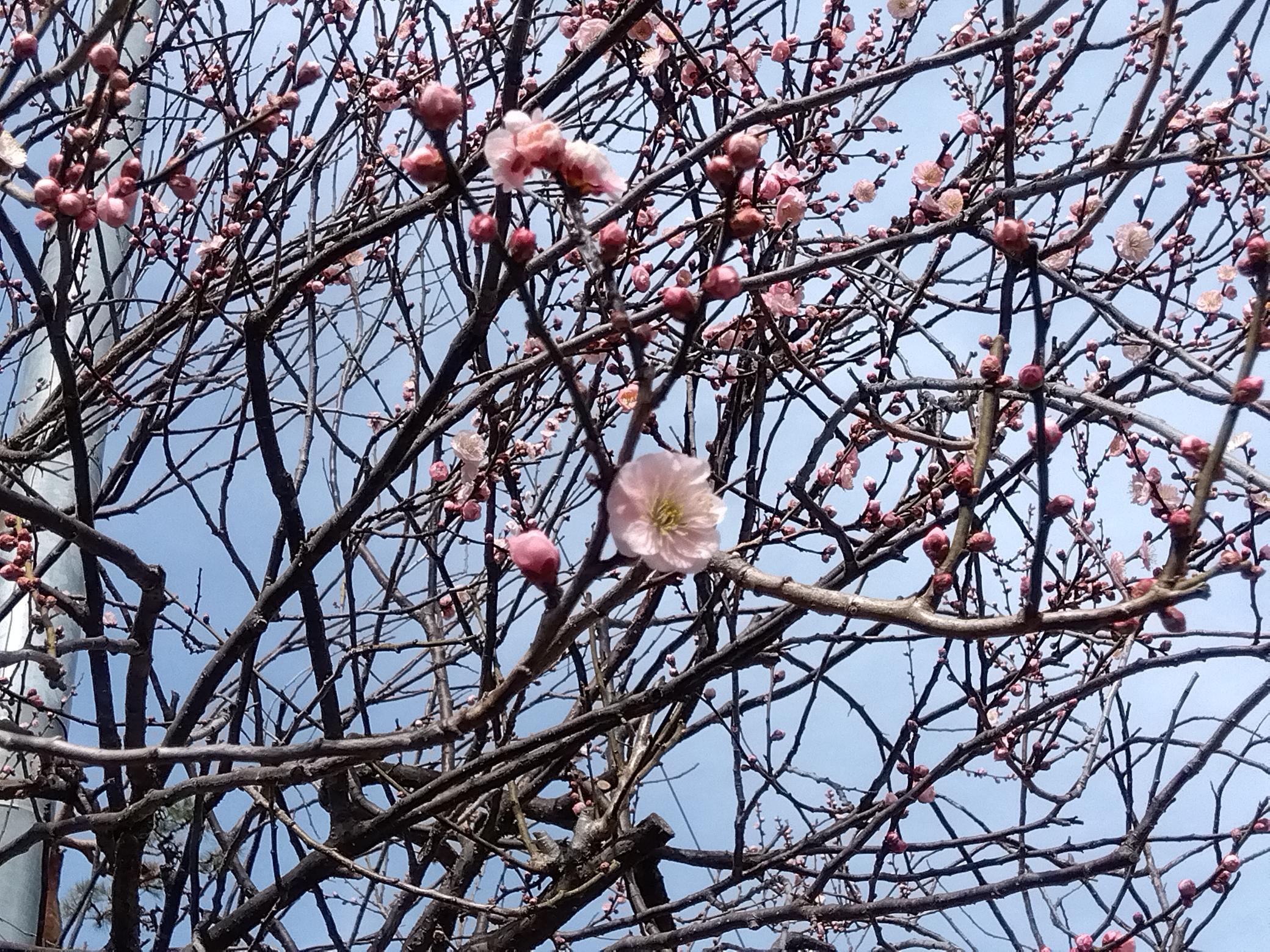 平日にもかかわらず、多数の来園者でにぎわっていました。いよいよ遅咲きの「豊後梅」「紅千鳥」「見鶯梅」「白加賀」などが開花を始めています。これからの2週間が最も見頃となりそうです。 「甲州野梅」は7分咲き 遅咲きの「見鶯梅」も開花! 1分咲きの「豊後梅」 駐車場脇の「緑宝」 遅咲きの「豊後梅」も開花”