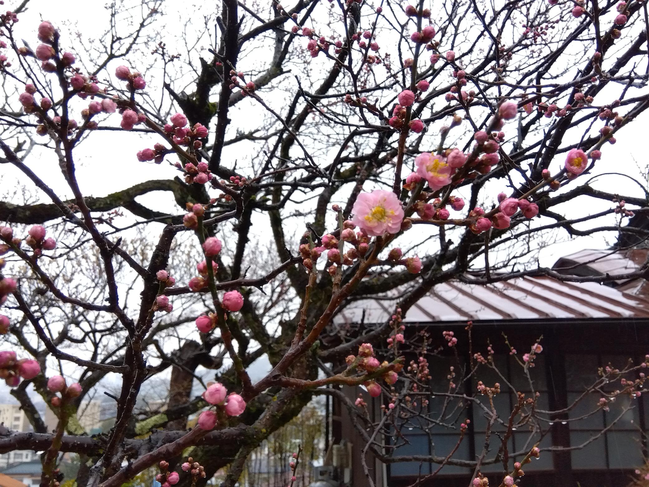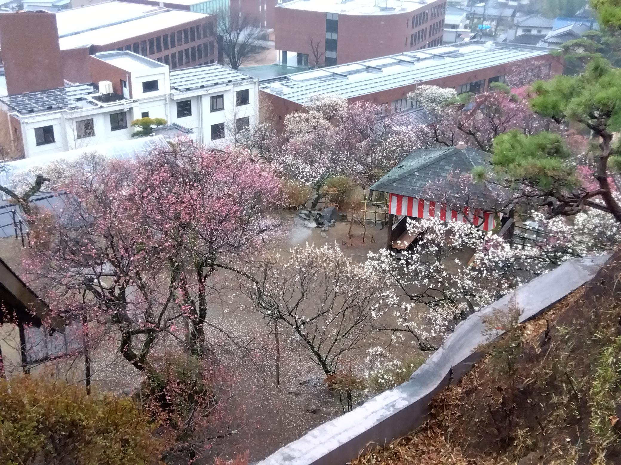 本当に久しぶりのまとまった雨に濡れた不老園です。埃だらけの道もしっとりと土の匂いが上がっています。花は生き生きと輝いています。明日は晴れの天気、園内は7分咲きまで開花が進んでいます。これからの10日間ぐらいが最も見頃になりそうです。 菅原道真公「梅天神安全祈願祭り」 梅天神広場の雨の不老園 展望台の「白加賀と紅千鳥」 「開運梅」開花! 雨のしだれ梅 花が輝く雨の不老園