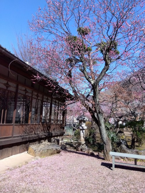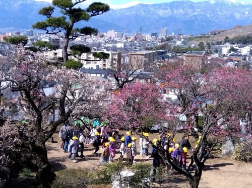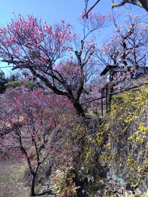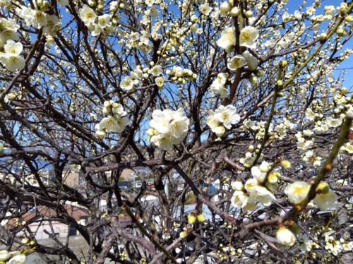 風が冷たい一日でしたが、快晴の天気となり、遅咲きの「紅千鳥」「豊後梅」「緑宝」「日光」「月影」などが続々開花してきました。