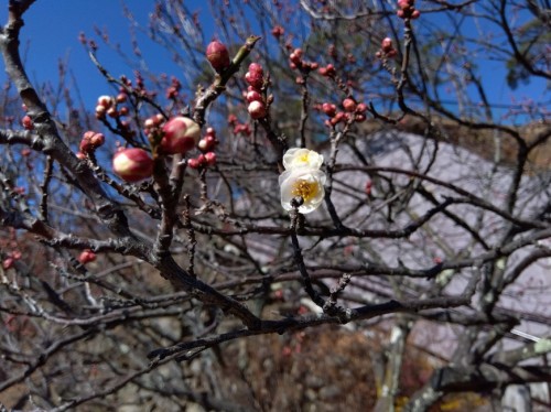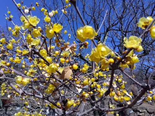 梅天神横の「玉牡丹」が2輪!! 本日31日に「玉牡丹」が園内で最初に開花しました。ただ他の花はまだ「つぼみ」状態です。近年では最も開花が遅い園内の花です。そのため1日より7日までは無料入園といたします。午前9時から午後4時までです。梅の花の開花を見つけにお越しください。 「ろうばい」は真っ盛り! 園内は「ろうばい」のみ。